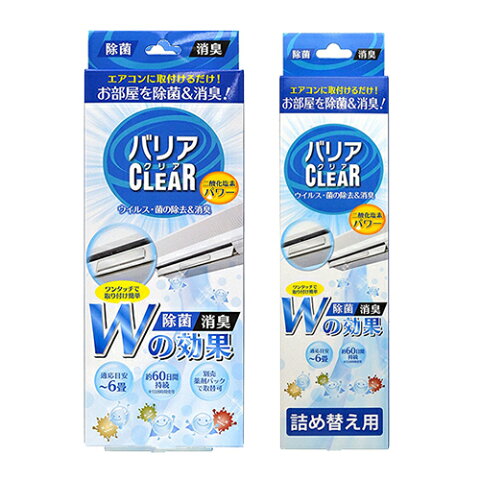 商品詳細 商品名 バリアクリア (ルーバー用) ( barrier clear ) 内容量 ●ケース本体:1個 ●アルミ袋入薬剤パック:1個 ●透明頬フィルム:1枚 ●取扱説明書:1部 ●詰め替え用カートリッジ20g:1個 成分 亜塩素酸ナトリウム、天然ゼオライト、水酸化ナトリウム 商品説明 エアコンにワンタッチ。